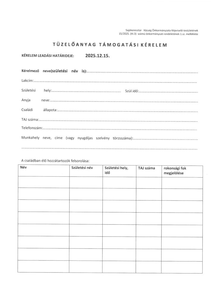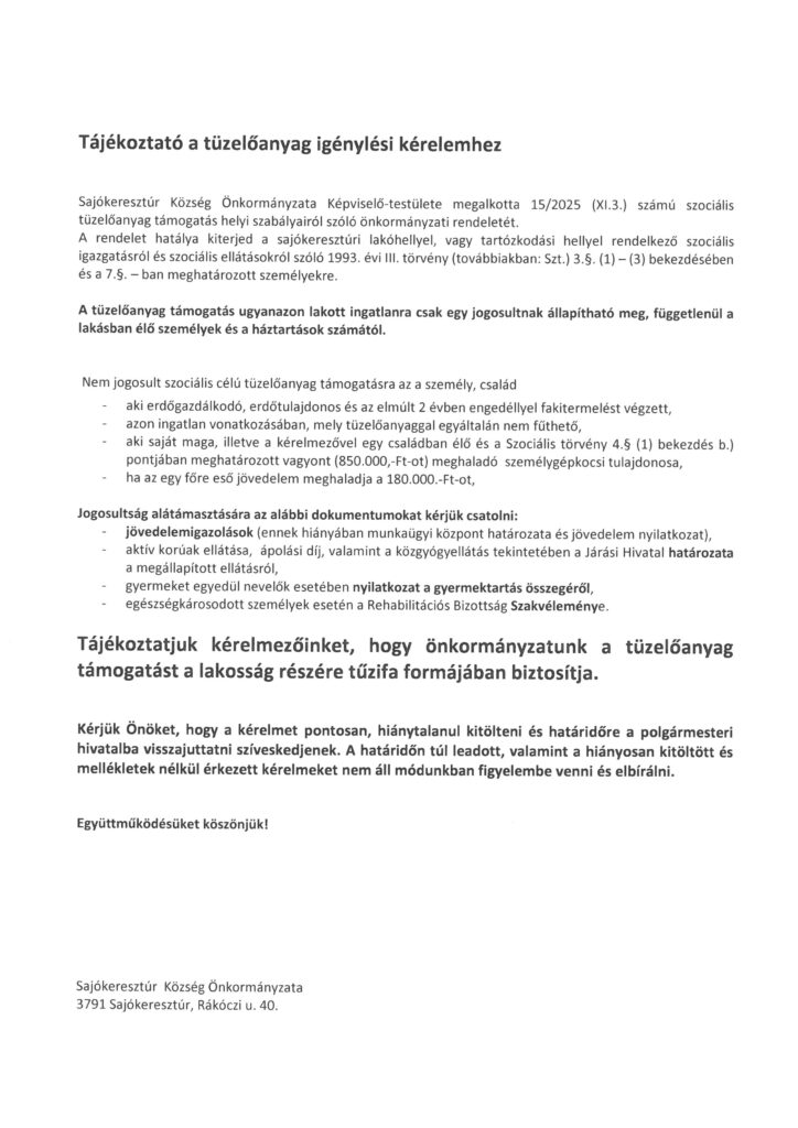 Sajókeresztúr Önkormányzata a 2025/2026-os évre meghirdeti a szociális tűzifa igénylést.
